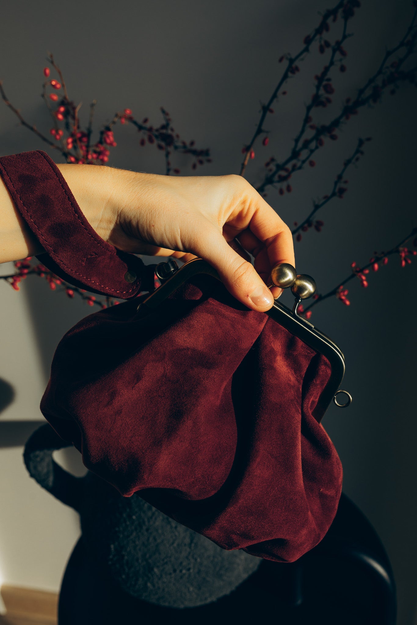 - Naturalna, burgundowa skóra zamszowa