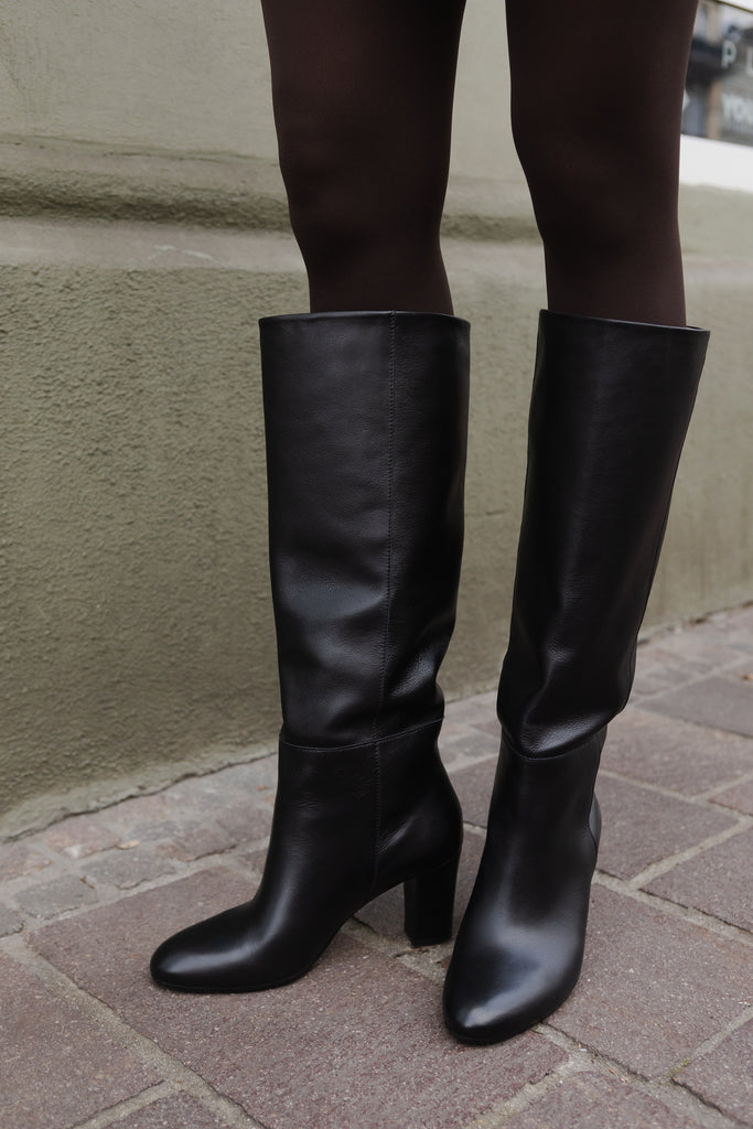 Wykonane w całości z naturalnej skóry, mają luźniejszy krój w kostce i pod kolanem, dzięki czemu subtelnie otulają nogę, zachowując swobodę i lekkość.