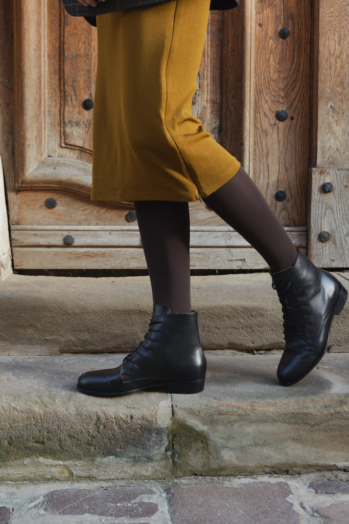 Każdy element został precyzyjnie dobrany: lekko skośne, stabilne i subtelne obcasy, nadające lekkości i nostalgicznego charakteru; bawełniane woskowane sznurówki; wygodny owalny kształt przodów; wysokość cholewki sięgająca nieco ponad kostki.