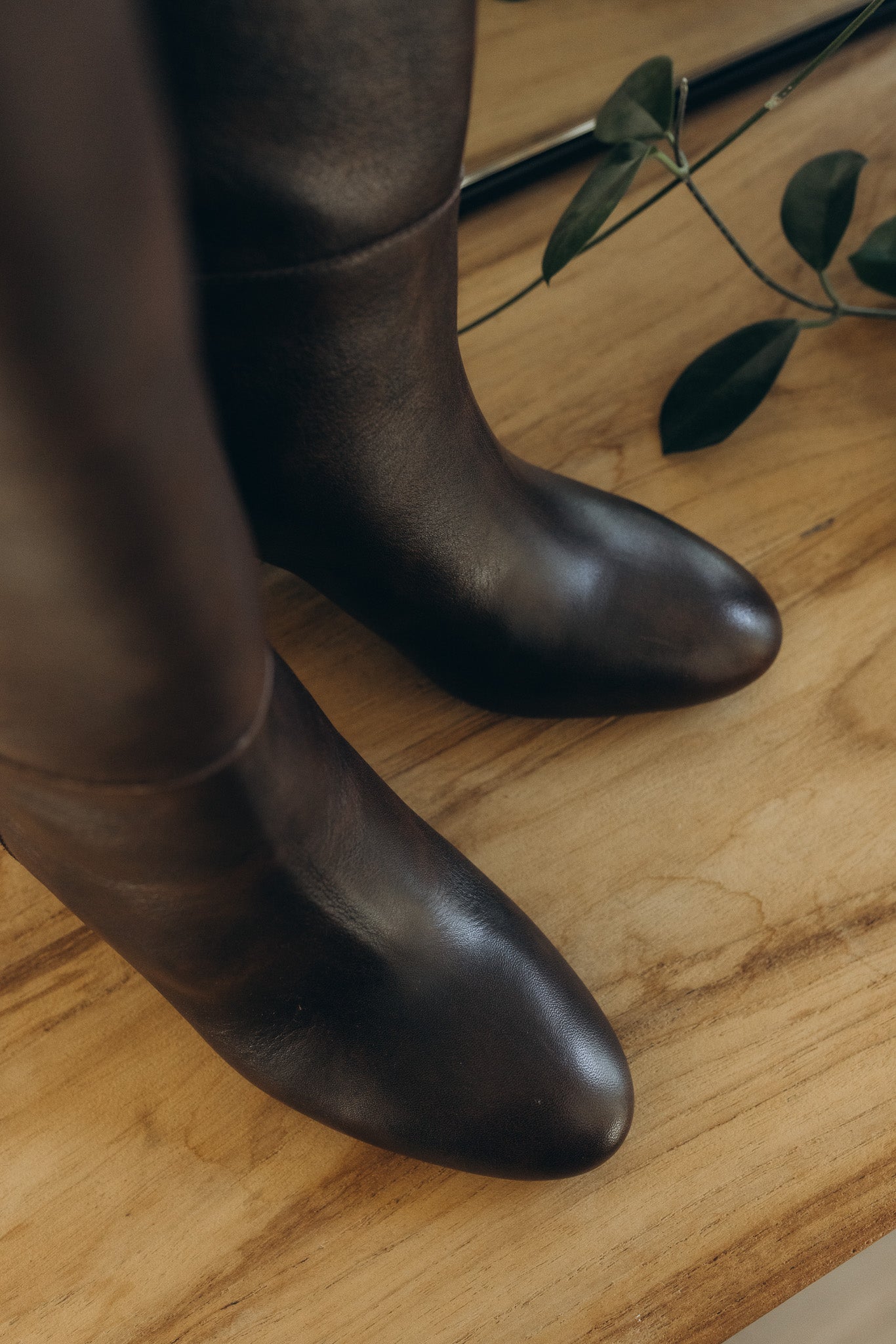 Wykonane w całości z naturalnej skóry, mają luźniejszy krój w kostce i pod kolanem, dzięki czemu subtelnie otulają nogę, zachowując swobodę i lekkość.